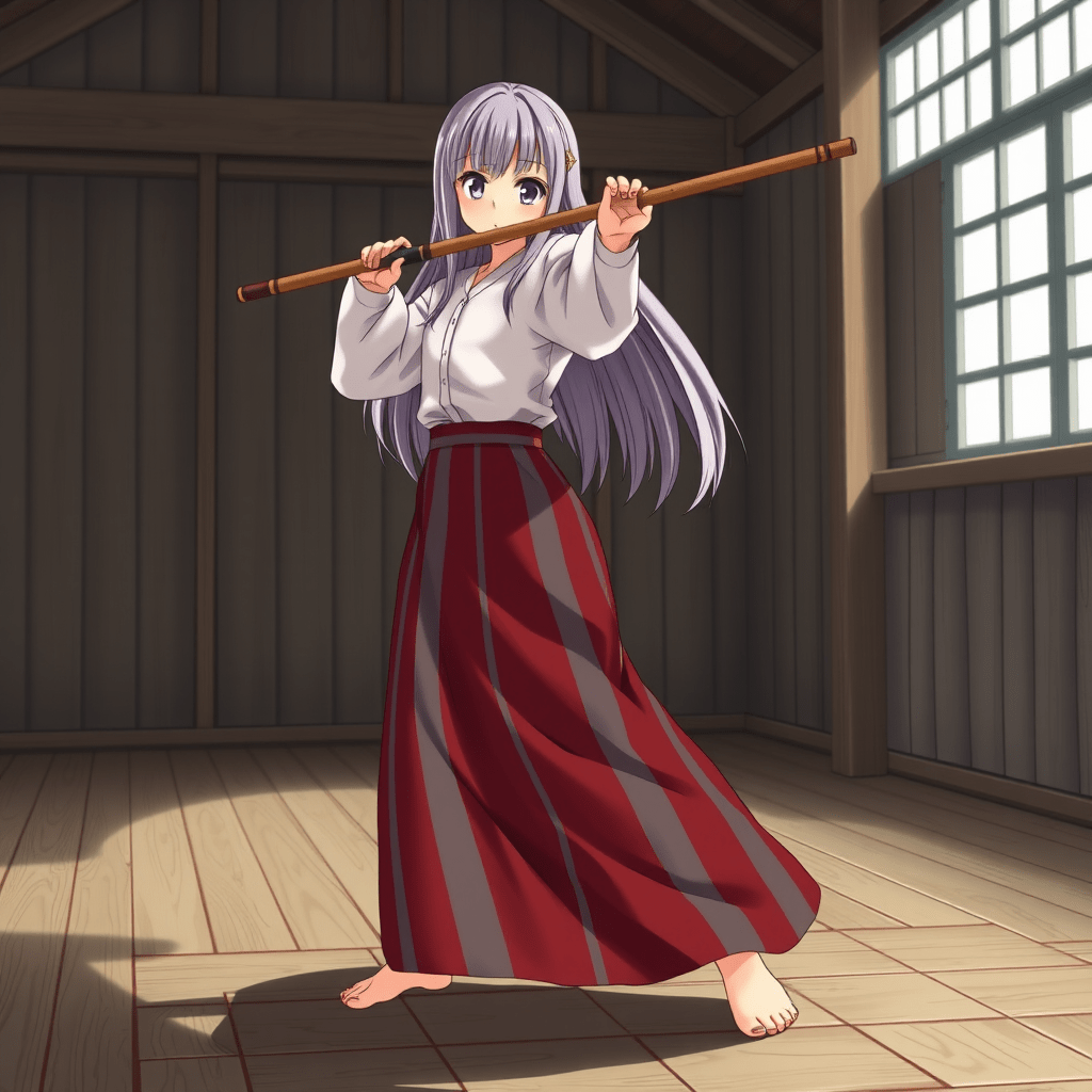 The anime girl’s weapon is a two-handed wooden straight pole stick.