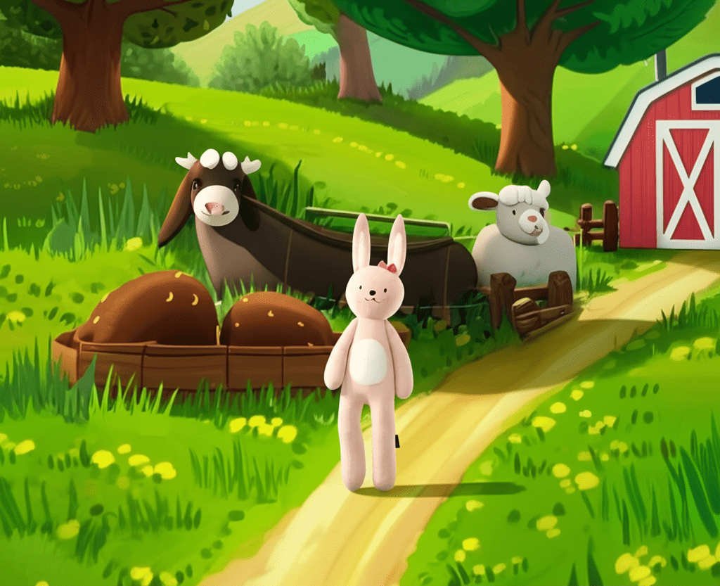 Lily the plush rabbit lived on a cozy shelf in a little girl’s room. One sunny morning, a playful breeze blew the window open, and Lily tumbled off the shelf, landing right in a basket filled with soft blankets. Unbeknownst to her, the basket was being packed for a trip to Grandma’s farm! When the car finally stopped, Lily found herself surrounded by the sights and sounds of a bustling farm. She peeked out of the basket and gasped – green fields, a red barn, and animals she had only seen in books!