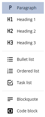 Text group : Change the style of the paragraph, convert it to a list, or change it to a blockquote or code block.