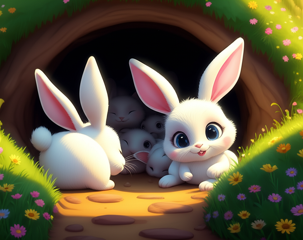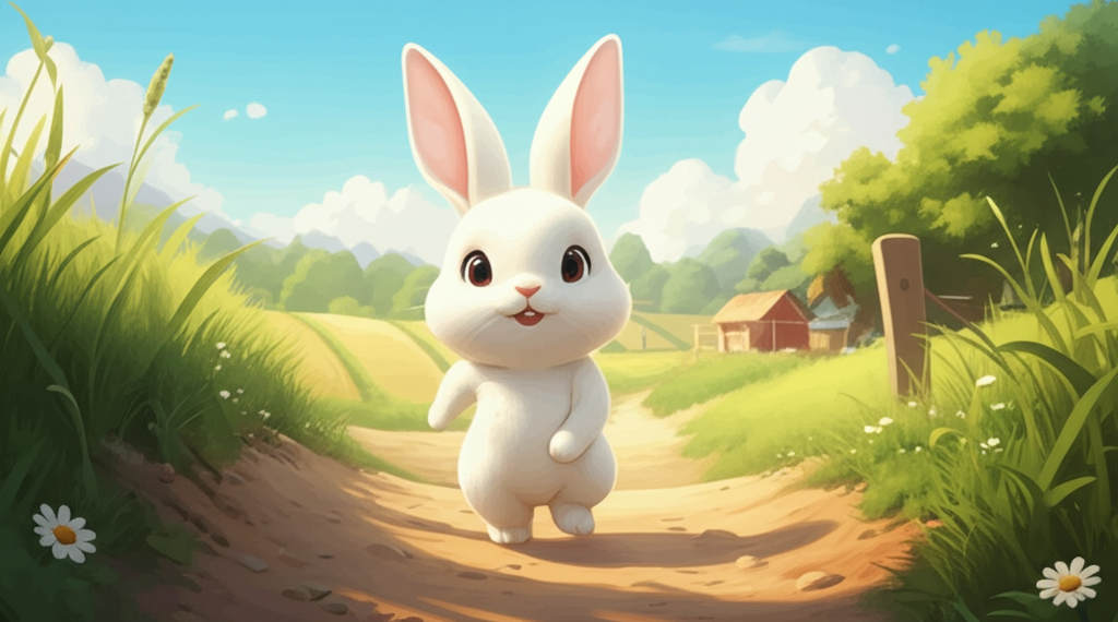 Once upon a time, in a lush green farm nestled beside rolling hills, lived a curious white rabbit named Snowball. He had soft, fluffy fur, bright pink eyes, and long, twitching ears that were always eager to hear new sounds. Unlike the other rabbits who were content nibbling clover in their burrow, Snowball dreamt of grand adventures beyond the familiar fields.