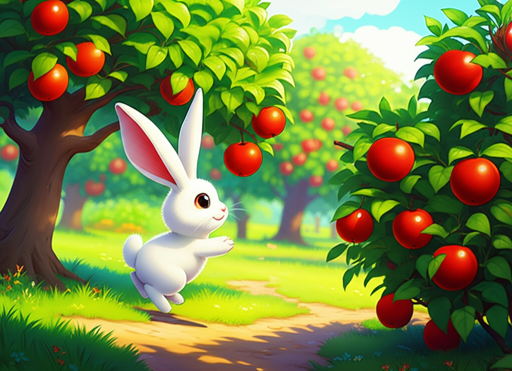 Next, Snowball ventured towards the orchard, where trees laden with juicy red apples swayed gently in the breeze. The air smelled sweet and fruity. He watched in amazement as a bright red apple tumbled from a branch and landed with a soft thud on the grassy ground.