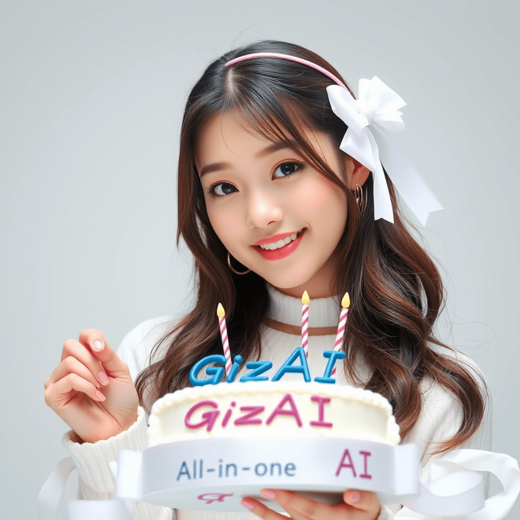 Generated by FLUX.1 Schnell with GizAI: A K-pop girl with a cake written “GizAI” and a ribbon written “All-in-one AI”